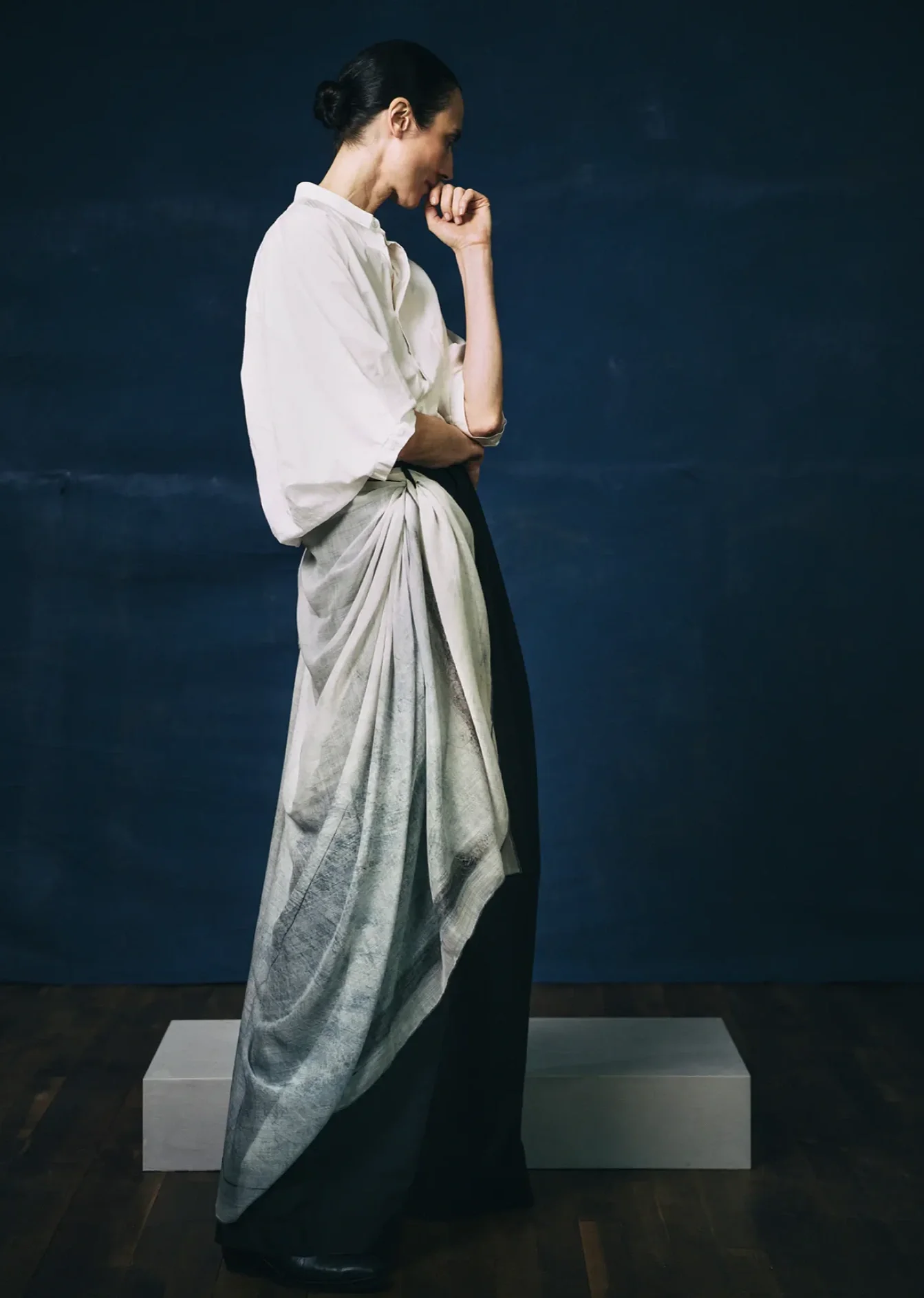 Darshana commented, “We enjoy several of Dot’s works in our private collection, acquired through Lemon Street Gallery in Cornwall, UK. We are delighted to have interpreted one of her subtle works, Division in Davy’s Grey, into a limited edition cashmere scarf which we can never tire of admiring.”